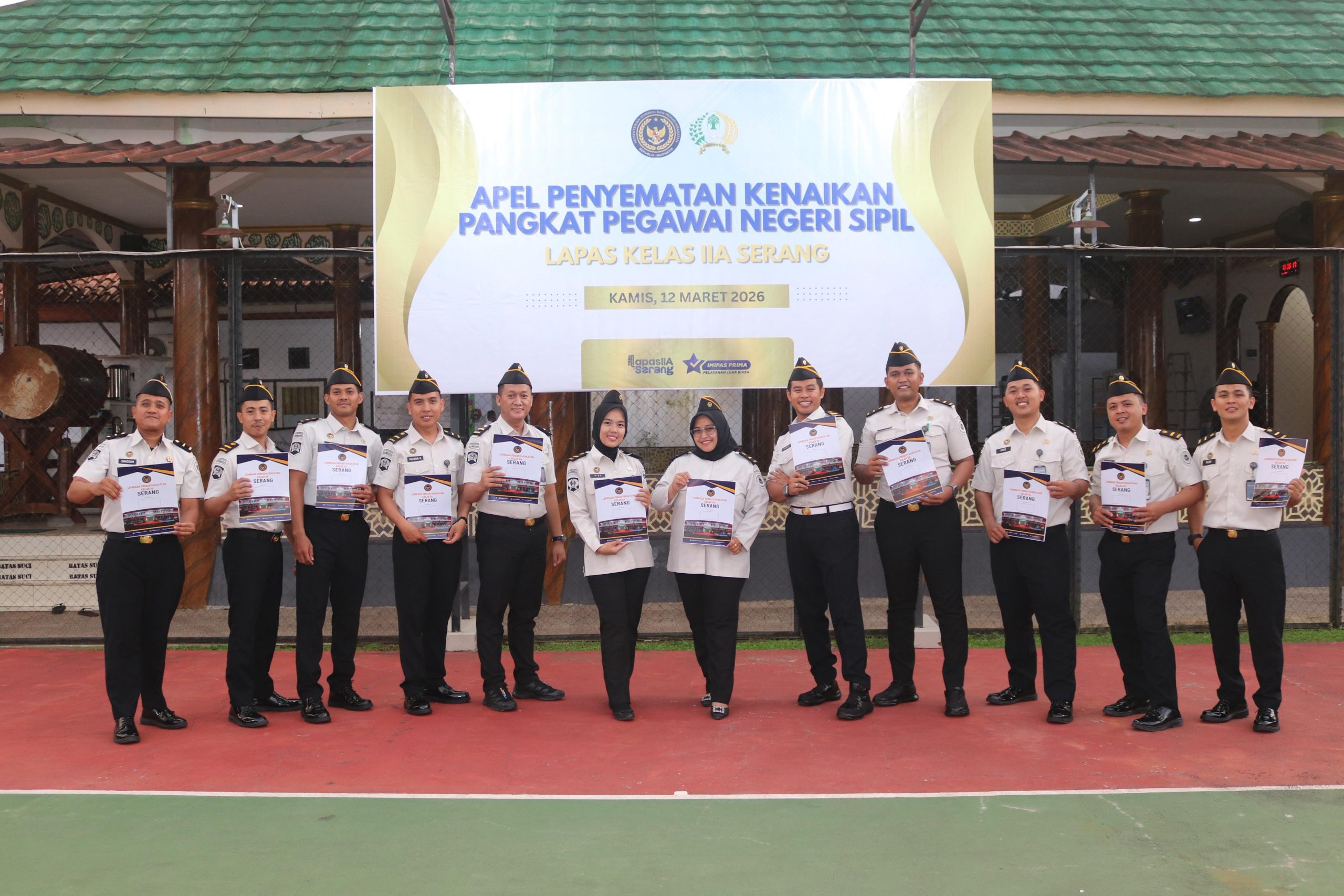 Serang, JD – Lembaga Pemasyarakatan (Lapas) Kelas IIA Serang menggelar upacara penyematan kenaikan pangkat bagi 12 pegawai, Kamis (12/3/2026) pukul 17.00 WIB di lapangan apel Lapas IIA Serang. Penyematan dipimpin langsung oleh Kepala Lapas Serang, Riko Stiven. 12/3/26.