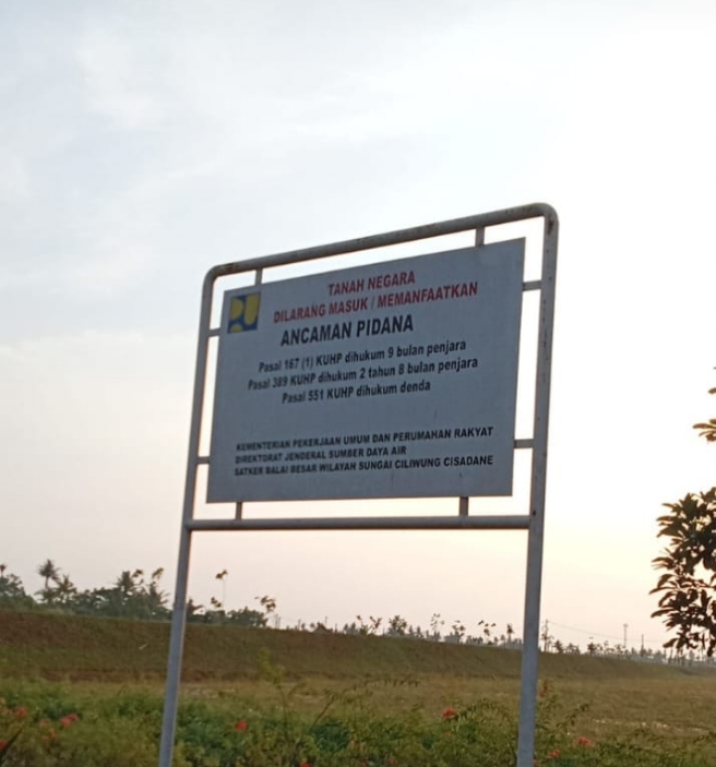 Selain itu penyerobotan lahan diatur dalam Pasal 385 KUHP yang kemudian diperkuat oleh plang berdiri kokoh pada lokasi lahan pengairan bertuliskan “Tanah Negara Dilarang Masuk/Memanfaatkan, Ancaman Pidana, Pasal 167( 1 ) KUHP dihukum 9 bulan penjara, Pasal 389 KUHP dihukum 2 tahun 8 bulan penjara, Pasal 551 KUHP dihukum denda, Kementerian Pekerjaan Umum dan Perumahan Rakyat, Direktorat Jenderal Sumber Daya Air Satker balai besar wilayah sungai Ciliwung Cisadane.