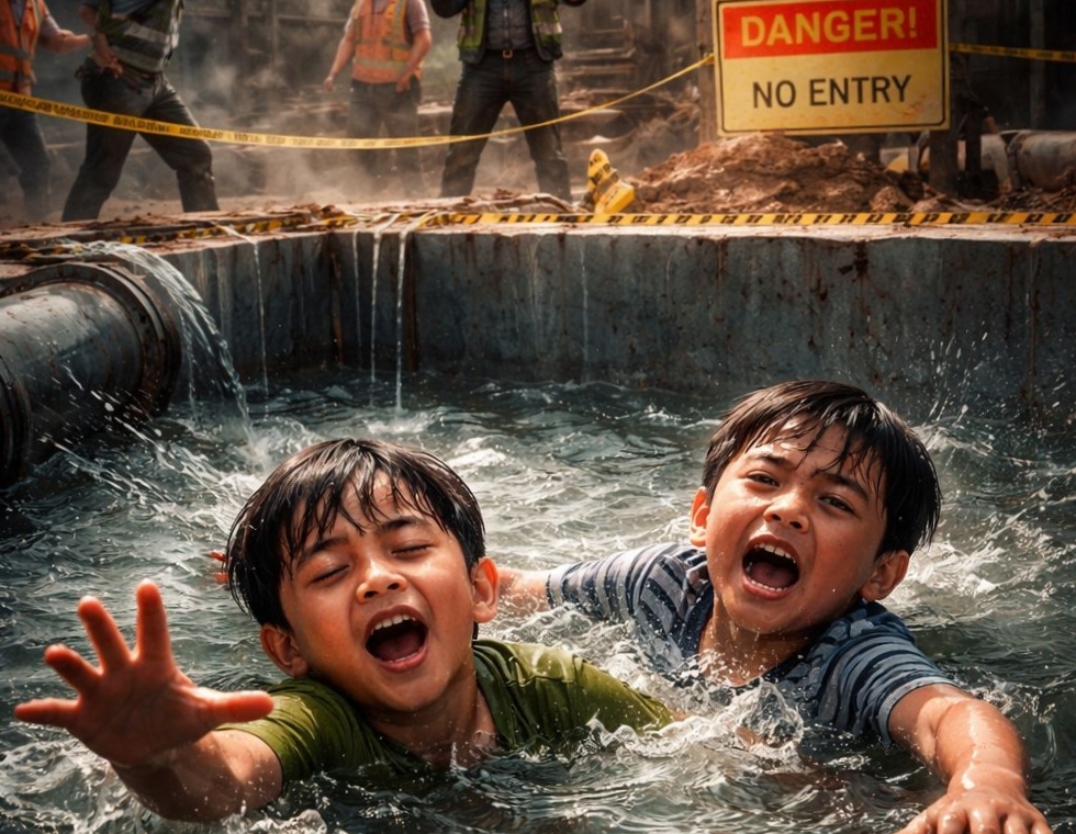 “Innalilahi wa innailaihi rojiun, dua anak kecil meninggal setelah hanyut di kolam proyek,” ungkap warga di sekitar lokasi.