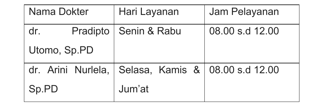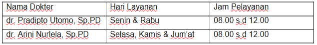 RSUD Tigaraksa menyediakan layanan pemeriksaan dan pengobatan di Poliklinik Spesialis Penyakit Dalam pada jadwal berikut :
