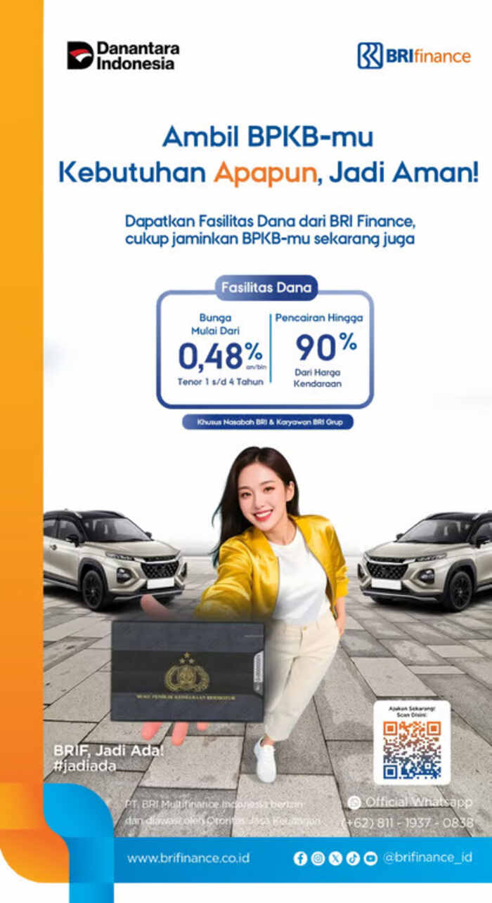 Selain itu, layanan BRI Flash memberikan solusi dana tunai hingga 90% dari nilai kendaraan atau maksimal Rp500 juta yang dapat dinikmati nasabah, dengan bunga ringan mulai 0,48% per bulan. Melalui proses yang cepat, aman, dan transparan, BRI Finance berkomitmen menjadi mitra terpercaya dalam mendukung kemandirian finansial masyarakat Indonesia.