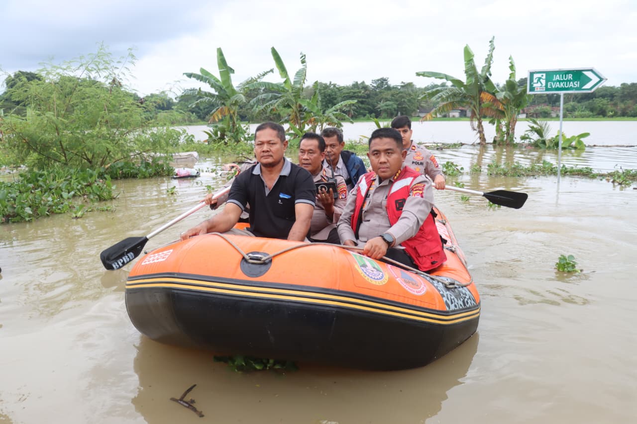 Untuk menjangkau titik-titik genangan yang cukup tinggi, Indra Waspada bersama jajaran menaiki perahu karet guna memantau kondisi permukiman warga dari dekat.